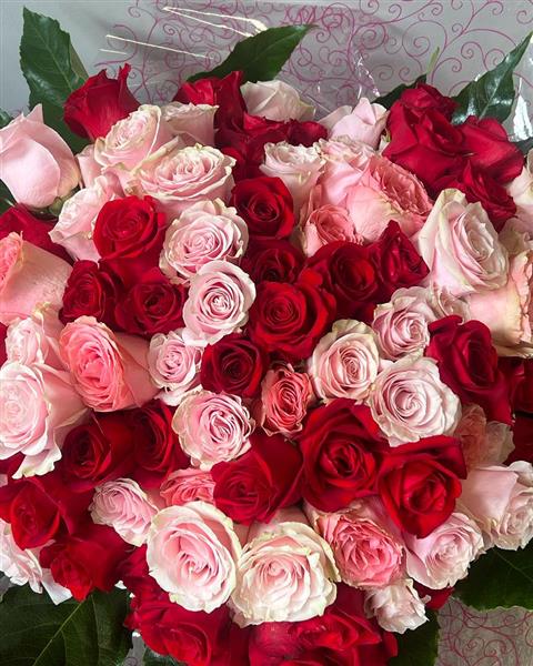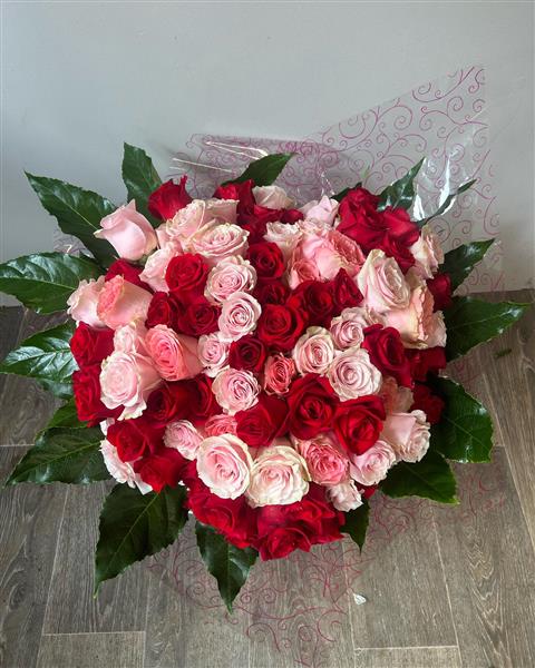A luxury mix of 100 high grade pink and red roses in a handtied Delivered in water