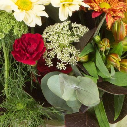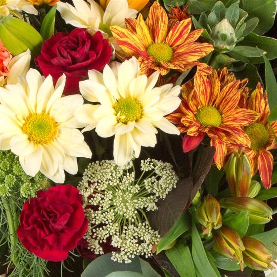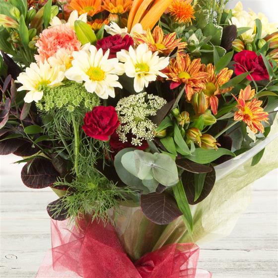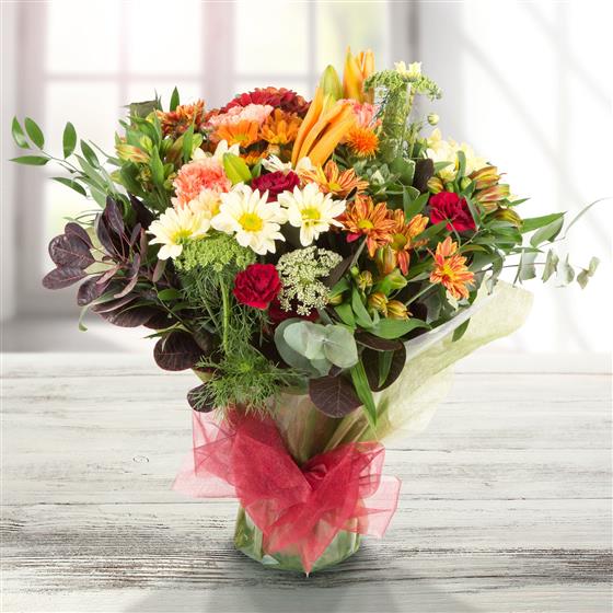 A beautiful versatile bouquet in autumnal shades is a real blaze of colour, with vivid oranges, rich reds and golden yellows.