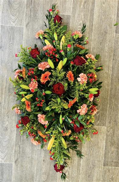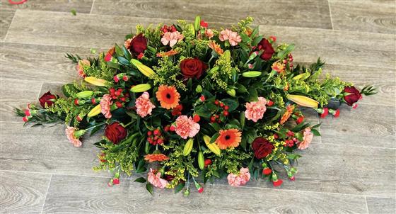 A vibrant family tribute of deep oranges and rusts including roses, lilies, mini gerberas, carnations and antirrhinum interspersed with golden solidago.