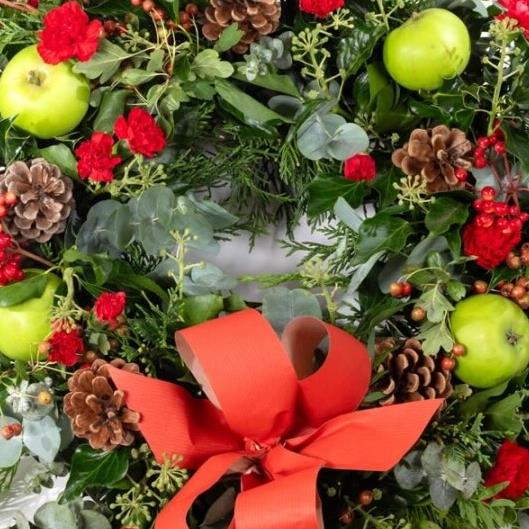 A large red bow sits at the bottom, giving the wreath a classic finishing touch. Its bright color brings together all the red elements and adds a sense of celebration.