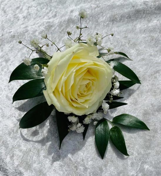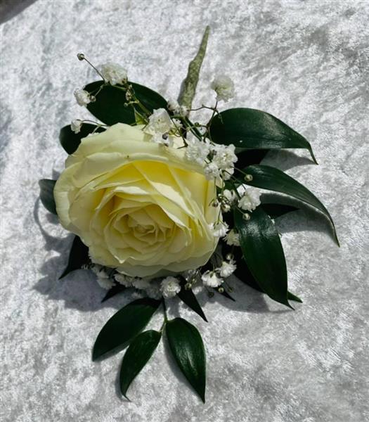 Ivory Rose Button hole with gyp and greenery, please call to discuss all your wedding requirements.
