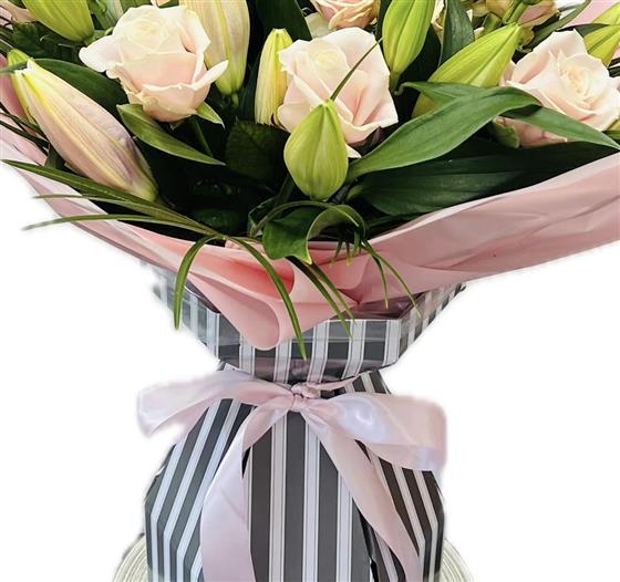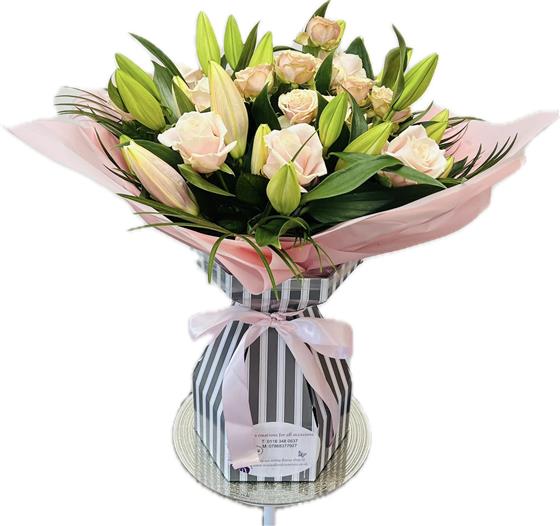 A bouquet full of prettiness with the very best large oriental pink lilies and the very best luxury pink roses.
