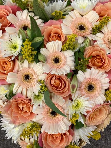 a peachy heart with gerbras,roses mixed with other seasonal flowers.