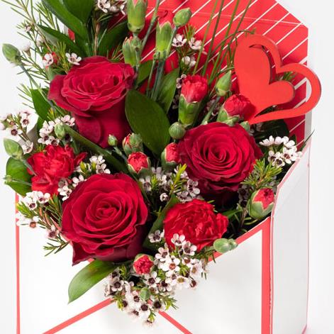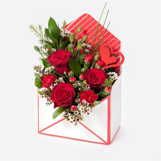 Send a message straight from your heart with this delightful envelope arrangement of romantic flowers
