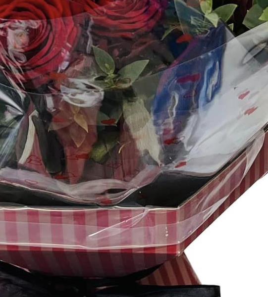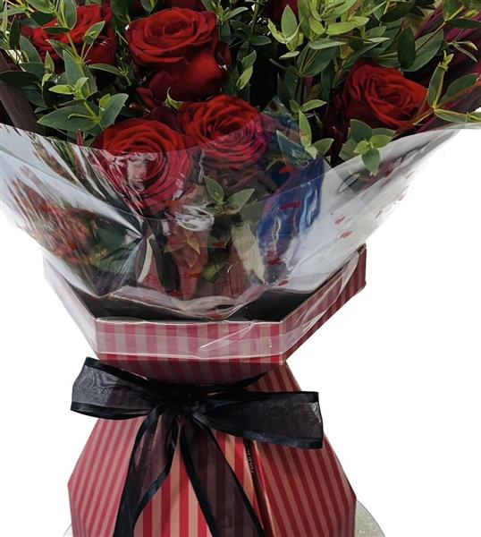 12 & 18 Top grade large headed velvety Freedom red roses mingled with mixed foliage presented in our presentations bouquet boxes in water.