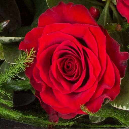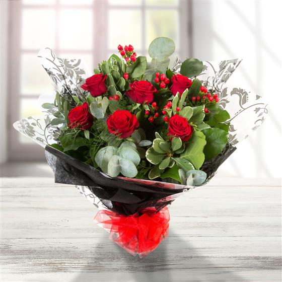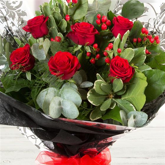 A hand-tied bouquet of six Top grade large headed sumptuous freedom red roses encased in a selection of greenery and presented in our presentation boxes delivered in water.