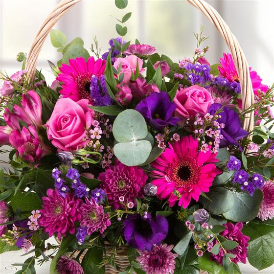 A colourful arrangement of cerise pinks and purples, including roses, mini gerberas, alstromeria and dainty wax flower.