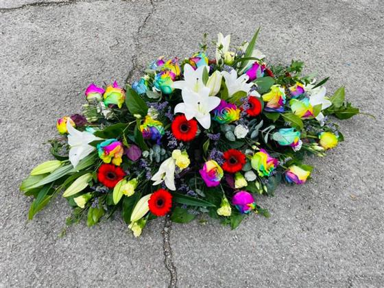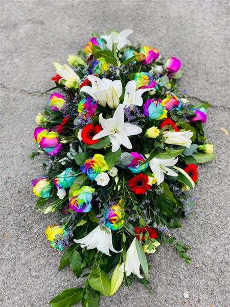 Rainbow casket spray full of rainbow roses and the best lilies mixed with other seasonal flowers. Please order 3 or more days in advance