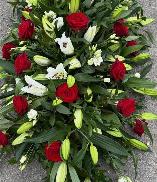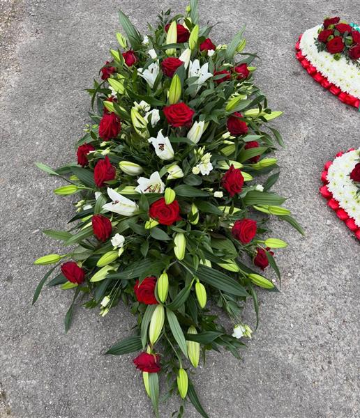 Red rose & White lilly Casket spray image displayed is a 5ft spray