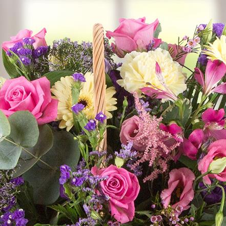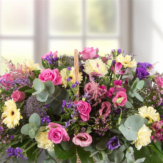 A large, natural style basket arrangement of dainty flowers in pretty summer shades of lemon, lilac, pink and purple.