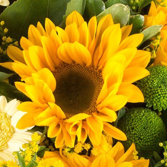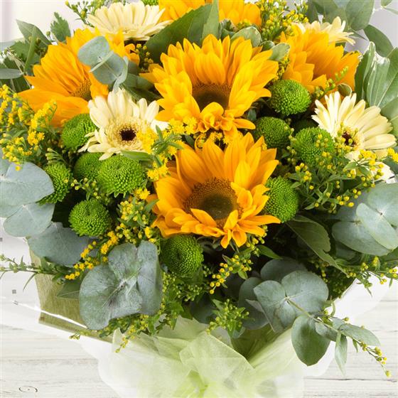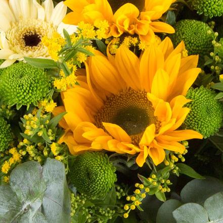 Sunflowers, mini gerberas and lime green kermit chrysanthemums hand-tied with seasonal foliage and golden solidaster. To avoid disappointment please contact us to check sunflower availability.