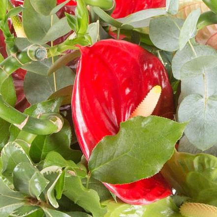 An extra special gift of long lasting mixed anthuriums, bamboo and foliage presented in a glass bowl.
