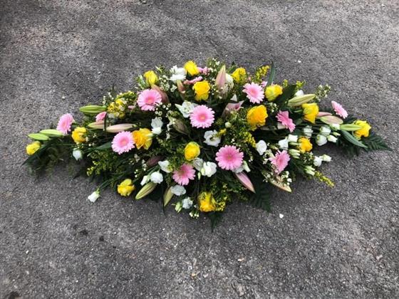 tutti fruity casket spray in Pinks and yellows with Lilly's,Roses,Gerbras and other all year round beautiful flowers. You can have this spray in many other colours too.