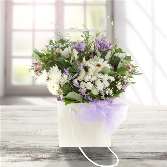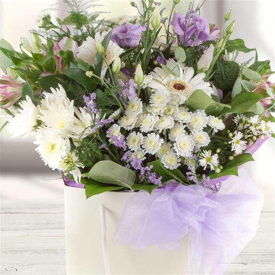 A crisp looking hand-tied bouquet of white and lilac blooms mixed with delicate foliage.