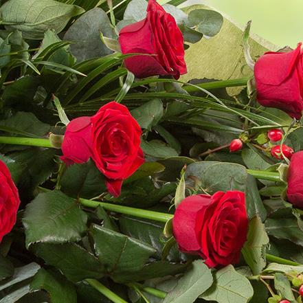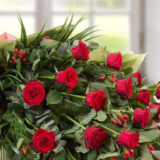 A simple, classic style bouquet of Top grade large headed Freedom red roses, unusual foliage. Choose from red, white, pink or yellow roses and either 12, 18 (as pictured) or 24 roses.