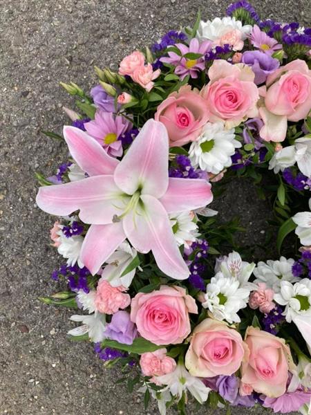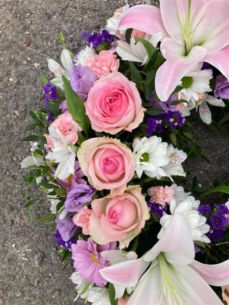 pretty in pink wreath with Lilly's and roses mixed with seasonal flowers